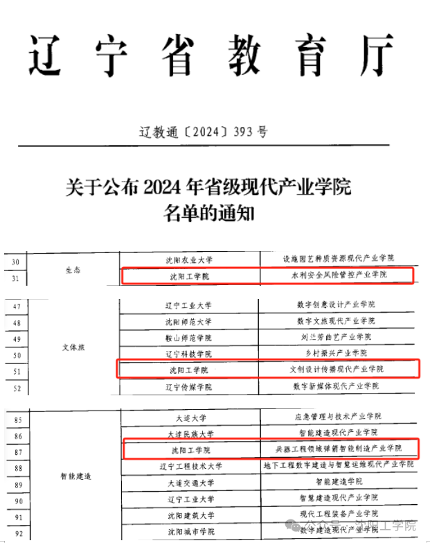 近日,辽宁省教育厅发布了《关于公布2024年省级现代产业学院名单的通知》(辽教通〔2024〕393号)。我校“水利安全风险管控产业学院”“文创设计传播现代产业学院”“兵器工程领域弹箭智能制造产业学院”3个现代产业学院成功获批。截至目前,我校共有8个省级现代产业学院。