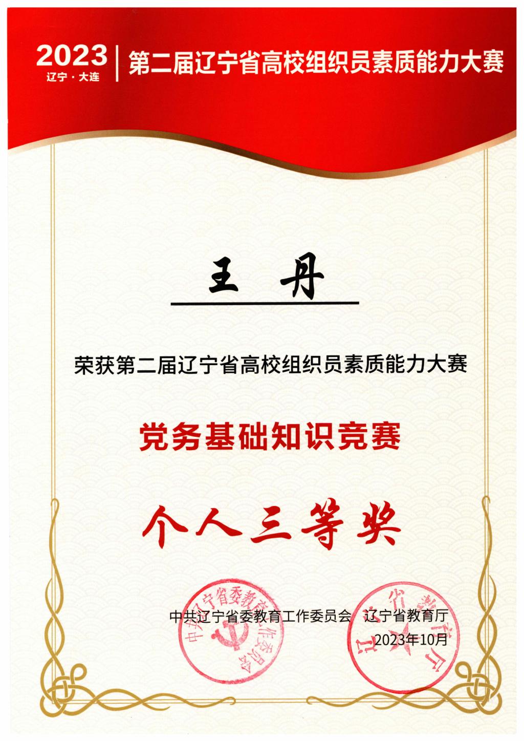 10月15日至17日,由省委教育工委、省教育厅主办的第二届辽宁省高校组织员素质能力大赛在大连海事大学举行,来自全省74所本、专科院校的220余名专职组织员参加了本次大赛。我校获优秀组织奖,党委组织部王丹获党务基础知识竞赛个人三等奖。