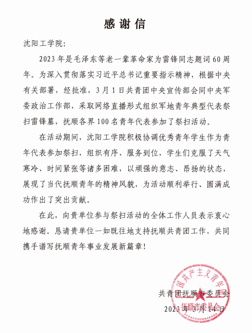 3月14日,我校收到共青团抚顺市委员会发来的感谢信,感谢我校50名青年大学生代表在3月1日中央军委政治工作部、共青团中央举行的祭扫雷锋墓活动中,组织有序、服务到位,克服诸多困难,以顽强的意志、昂扬的状态,展现了新时代青年的精神风貌,为活动顺利举行、圆满成功作出贡献。